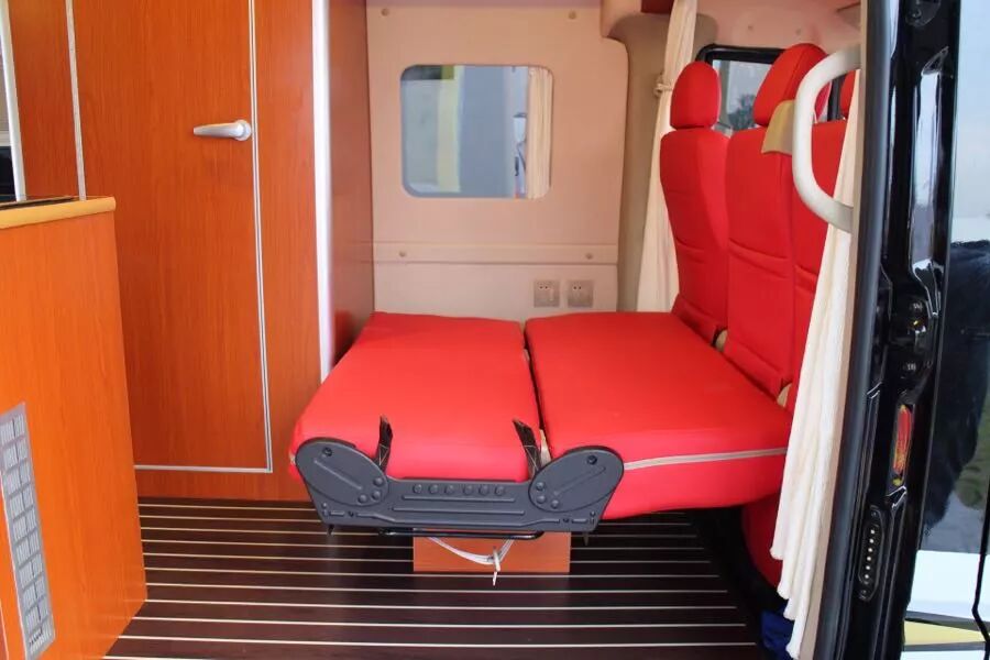 第二排是一個三人座椅,行駛時可以舒適乘坐,休息是可以放成一個小單人床,擴(kuò)展車內(nèi)的睡眠功能。