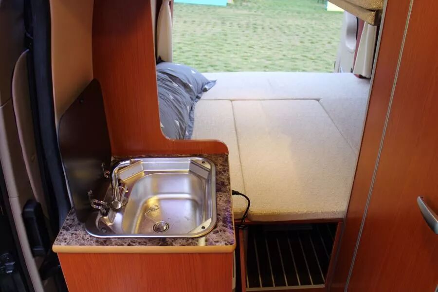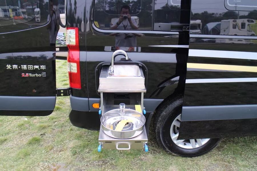 座椅后方是衛(wèi)生間,提供冷熱洗浴,熱水采用發(fā)動加熱方式,不用擔(dān)心無熱水狀態(tài)。便攜式馬桶更加方便實用。衛(wèi)生間內(nèi)配有雙向換氣天窗,既可洗浴方便時使用又可以防蚊蟲,中門側(cè)的吧臺配有洗菜洗漱盆,洗菜時打開方便洗涮,合上可以放置物品。