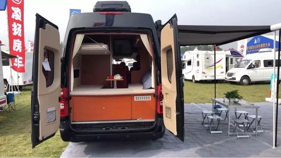 車身側面配有一個3500*2500mm的超大遮陽棚,車身側面幾乎可以達到全覆蓋。支一套桌椅,便可享受愉快的旅行時光,還有外接水電接口,房車入口配有迎賓踏步。車尾門采用雙開門設計,整車貫通后通風性很好,尾部還有儲物柜的設計,可以把大件行李放在里面。