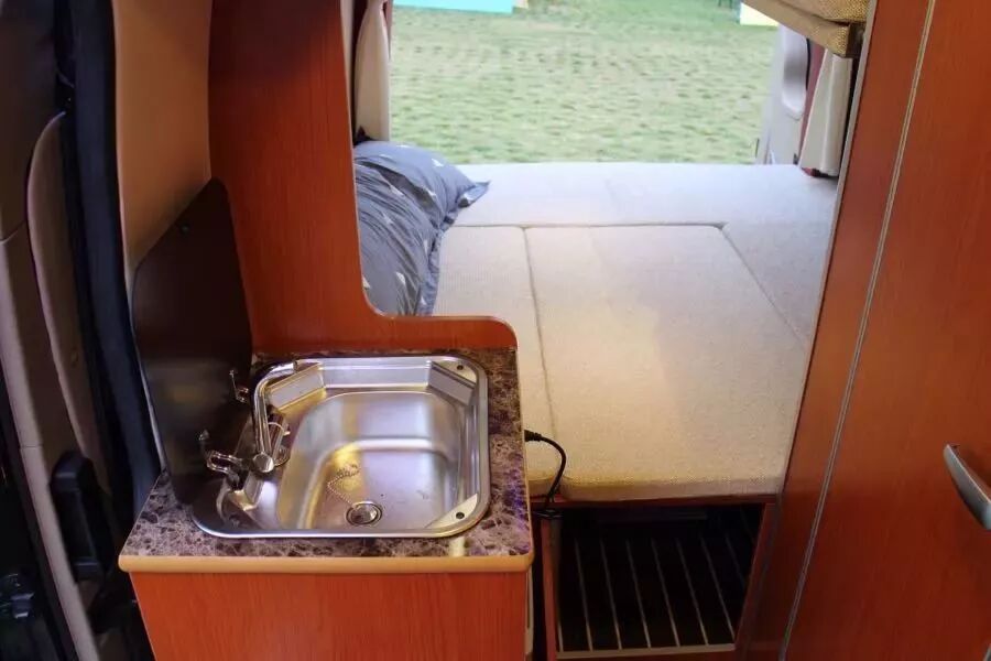 座椅后面車內衛(wèi)生間,衛(wèi)生間內配有馬桶和淋浴。水路方面,房車配有110L清水箱和70L污水箱,可以滿足一家人2-3天的日常使用。車廂中部的隱藏式水池平時可以作為面盆使用,早上起床不用在車外刷牙、洗臉。