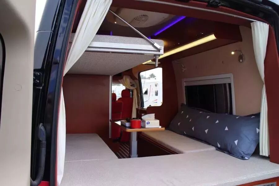 車尾休息區(qū)的設計將功能性發(fā)揮到了極致,B型車的會客區(qū)注定會受到車型內尺寸的限制,而福生采用將車尾休息區(qū)變成了一個U型卡座的方法,日常讓一家人也可以圍坐一桌聊天吃飯,晚上休息時,桌板降下來鋪上墊子就可以變成一張大床,兩個成年人可以舒舒服服的休息。