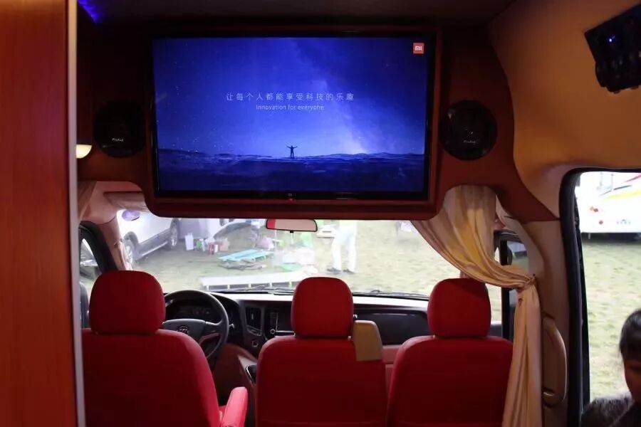 在駕駛室的上方配備了一臺小米智能電視,可以播放在線視頻內容、插U盤或連接HDMI播放電腦視頻,下方配有隱私簾,將駕駛室和生活區(qū)隔開,駕駛座后方是雙人沙發(fā)座椅,可以拼成一張單人床,比較適合兒童休息使用。